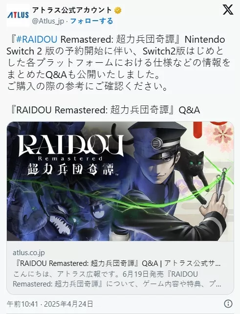 今日,Atlus正式开启了任天堂Switch 2版本《RAIDOU Remastered: 超力兵团奇谭》的预购通道,并同步发布了游戏的开场视频。